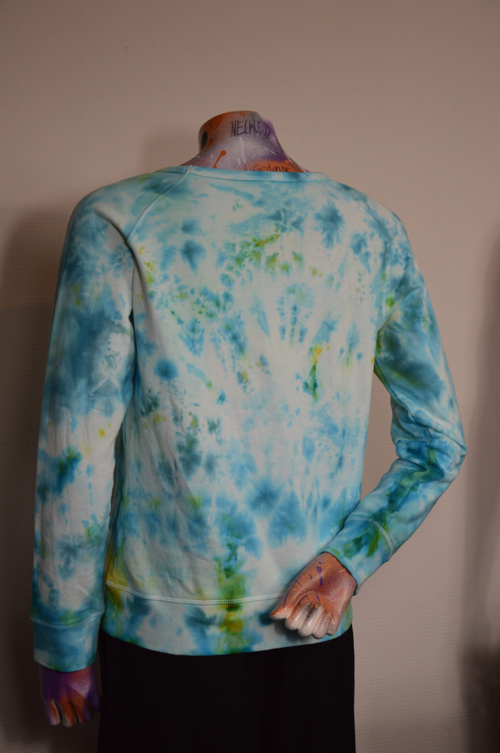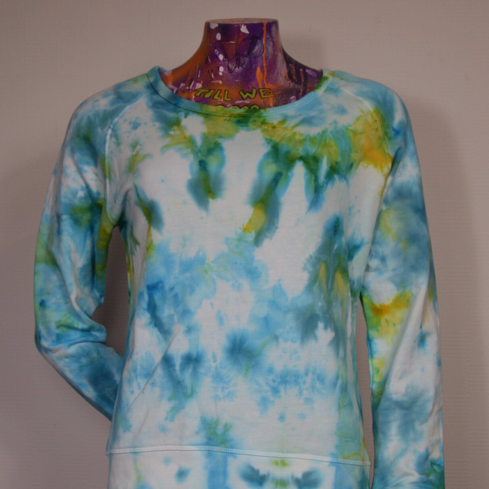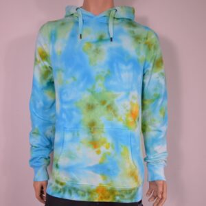 Das Design: Mit Eis gefärbter Damen Pullover mit weitem runden Ausschnitt in Größe L in Türkies und Gelb. Dank der Eisfärbe Technik sind die Farben besonders intensiv und lebendig. An vielen Stellen vermischen sich die Grundfarben zu unendlichen Farbabstufungen und bilden ein kühles, aber auch positives Design, dass sich nach frühling anfühlt.