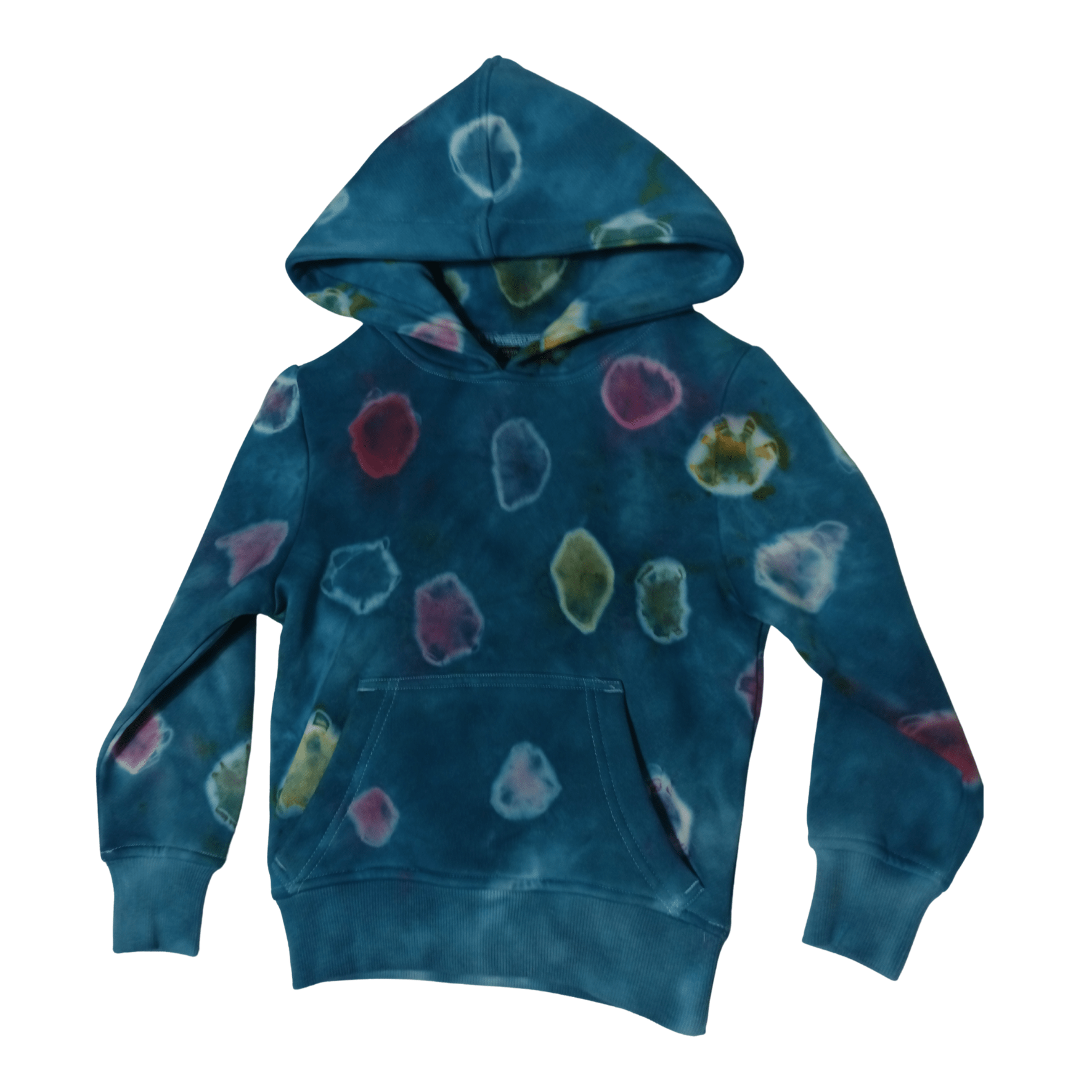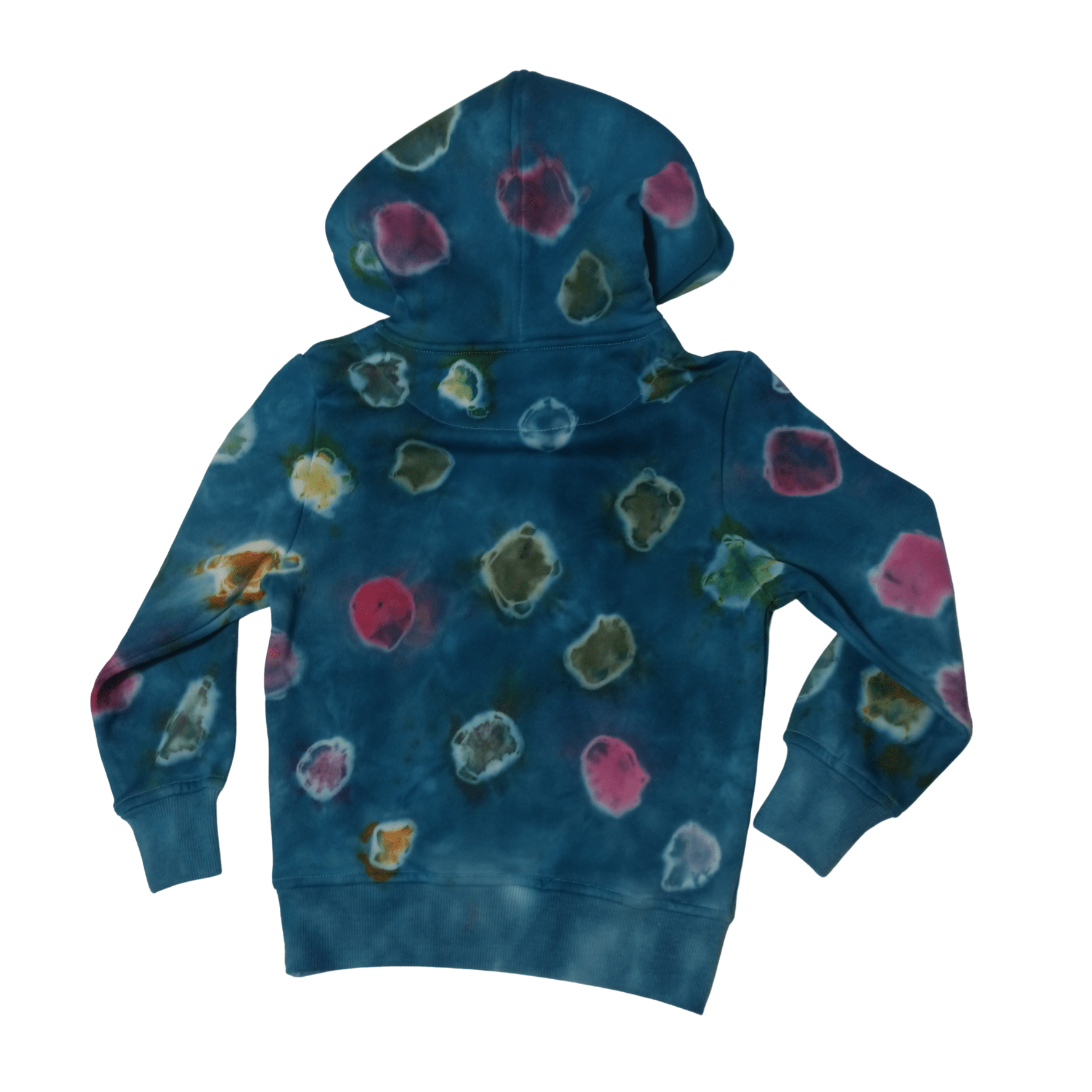 Ein Kinderhoodie, so verspielt wie die Jüngsten selbst. Aus zufällig platzierten Kreisen und verscheidenen Farben entsteht der Seifenblasen Effekt. Der Hintergrund ist in Opal Blau gefärbt.Der Rohling: